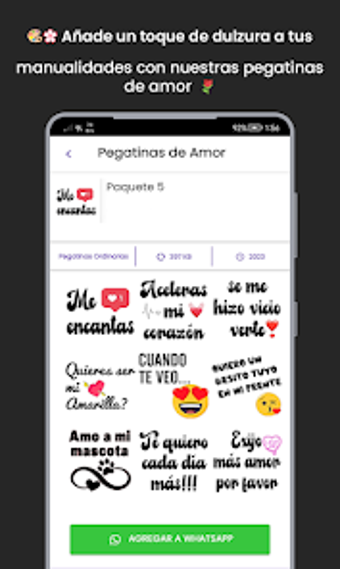 Stickers de amor WASticker är en gratis applikation för Android som erbjuder ett brett utbud av kärleksklistermärken. Med dessa klistermärken kan användare enkelt lägga till en personlig och romantisk touch i sina WhatsApp-konversationer. Applikationen gör det möjligt att välja från olika paket av klistermärken, som kan användas för att uttrycka känslor och skapa en mysig atmosfär. Genom att följa enkla steg kan användare snabbt integrera klistermärkena i sina chattar.